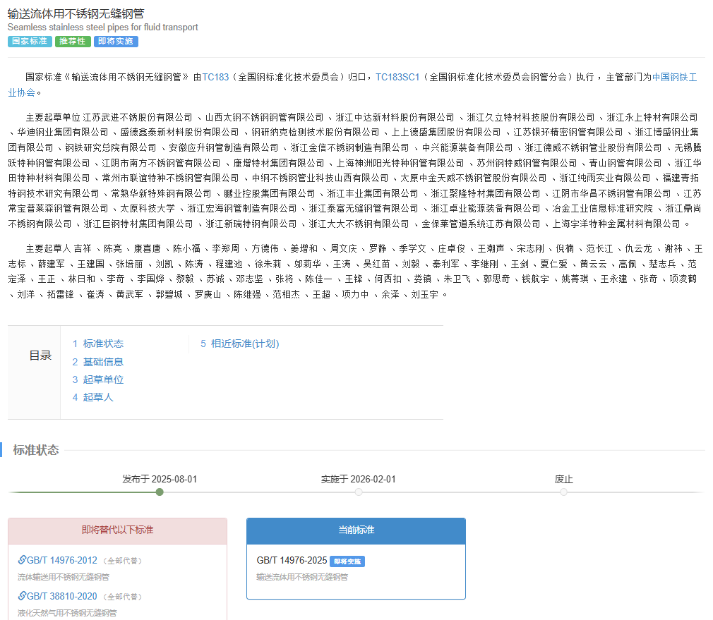 2025年8月1日,由江蘇武進(jìn)不銹股份有限公司 、山西太鋼不銹鋼鋼管有限公司 、浙江中達(dá)新材料股份有限公司 、浙江久立特材科技股份有限公司等主要單位起草的國(guó)家標(biāo)準(zhǔn)《輸送流體用不銹鋼無(wú)縫鋼管》發(fā)布,將于2026年2月1日實(shí)施。
