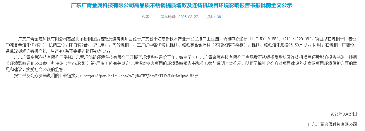2025年8月27日,廣東廣青金屬科技有限公司高品質(zhì)不銹鋼提質(zhì)增效及連鑄機項目環(huán)境影響報告書報批前全文公示。