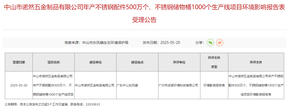 2025年5月20日,中山市東鳳鎮(zhèn)生態(tài)環(huán)境保護(hù)局受理中山市諾然五金制品有限公司年產(chǎn)不銹鋼配件500萬(wàn)個(gè)、不銹鋼儲(chǔ)物桶1000個(gè)生產(chǎn)線項(xiàng)目環(huán)境影響報(bào)告表并對(duì)外進(jìn)行公告,公告期:5個(gè)工作日。
